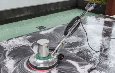 DECAPAGE DE REMISE EN ETAT pour les revêtements très encrassés. Apllication d'un produit décapant puis passage d'une monobrosse basse vitesse
